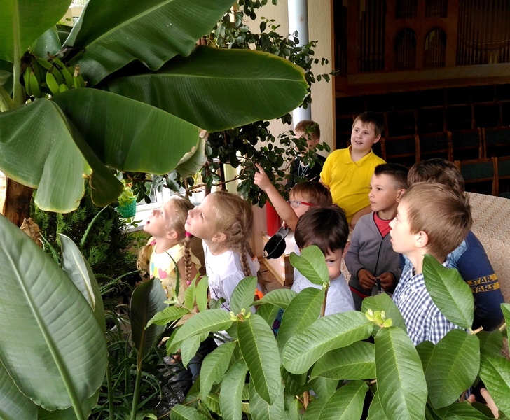 Полюбоваться тропическими растениями на этот раз пришло 18 человек. Ребята с необычной для них точки зрения рассматривали вроде бы знакомые всем фикусы и диффенбахии, узнавая из рассказа педагога подробности жизни этих растений у себя на родине, в тропиках.