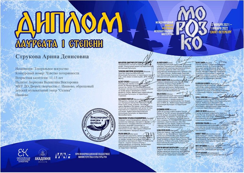 С 12 ноября 2021 года в Санкт-Петербурге проходил Международный конкурс-фестиваль исполнительского искусства «Морозко». Этот марафон закончился 1 января 2022года. В конкурсе приняла участие учащаяся образцового детского музыкального театра «Селена» - Арина Струкова. За свою творческую работу артистка получила Диплом Лауреата первой степени в номинации «Театральное искусство».